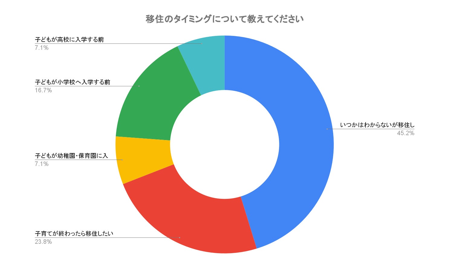 理由からは、「子どもの教育・自然の豊かさといった生活環境を考慮し関心を持った(83.3%)」が最も多く、次に多かったのは「地域コミュニティが豊かな環境で子育てがしたい(40.5%)」でした。その他の回答には、「出身地にUターンしたい」、「生活コストを下げたい」といった理由が全体の2割程度を占めました。調査結果より、移住に関心を持つ理由として、子どものためだけでなく、ママ・パパ自身が伸びやかに子育てができるとして、移住に関心を持つ傾向があることがわかりました。