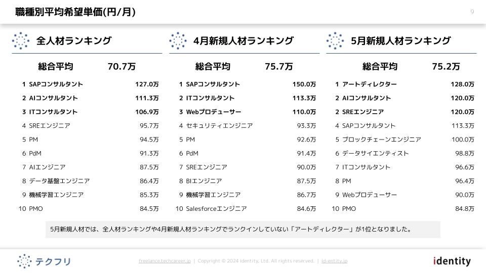 ITフリーランスエンジニアの案件・求人サイト「テクフリ」(https://freelance.techcareer.jp/)を運営する株式会社アイデンティティー(東京都新宿区、代表取締役:今野 力、以下「当社」)は、テクフリのデータベースをもとに2025年5月における人材の市況感を調査しました。より詳しい結果については、お問い合わせから資料請求が可能です。