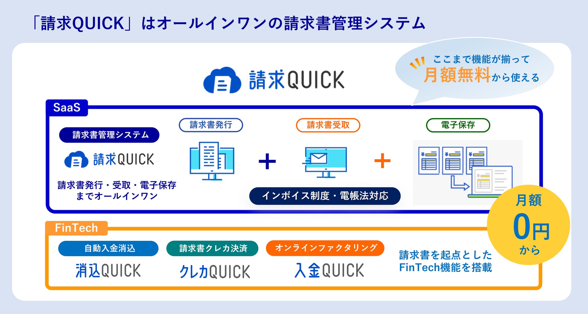「請求QUICK」は、法制度対応と業務効率化を実現するクラウド型請求書管理システム(SaaS)をベースに3つのFinTech機能が組み込まれており、月額無料からご利用いただくことができます。金融機関とのAPI連携による自動明細取得機能で面倒な入出金の消込作業を大幅に効率化する「消込QUICK」、発行した請求書をクレジットカードでオンライン決済できる「クレカQUICK」、発行した請求書をWeb完結で資金化できるオンラインファクタリング「入金QUICK」という3つのFinTech機能を、すべて1つのシステムで提供しています。SaaS & FinTechのノウハウや最新技術を詰め込んだ「請求QUICK」は、経理業務の効率化に課題を抱える中小企業にとって非常に利便性の高いシステムとなっております。