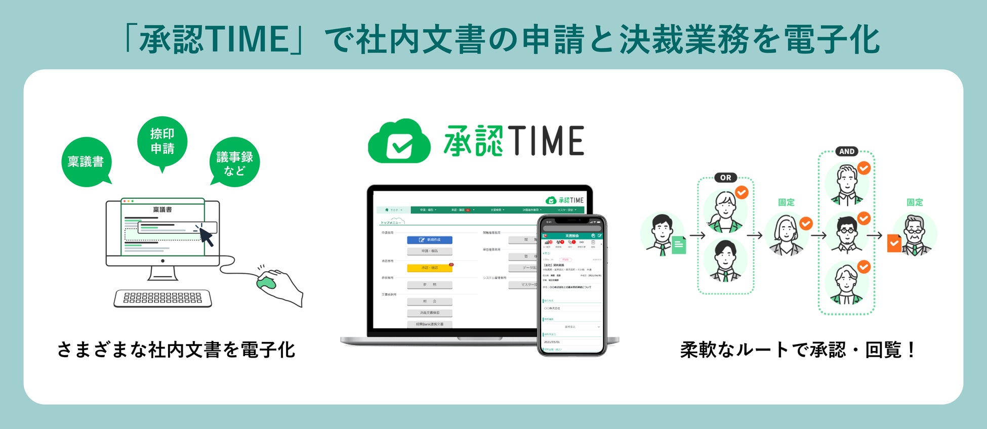 「承認TIME」は、稟議申請、捺印申請をはじめとした社内文書の申請・決裁・保管業務をデジタル化するクラウド型ワークフローシステムです。書式作成はテキストやリスト選択、チェックボックスといった項目を選択して直感的に設定できるため、システムに関する専門知識不要で、誰でも手軽に短期間で導入が可能です。またマルチOS対応により、PCのみならずスマートフォンやタブレットでも、外出先や出張先からかんたんに申請・承認ができるため、リモートワークや多拠点においてもスムーズかつスピーディな意思決定が可能になります。ワークフローをデジタル化することで社内文書の紙が不要になり、ペーパーレス化の促進とともに、承認履歴のデータ管理で、承認プロセスの「見える化」にも貢献します。