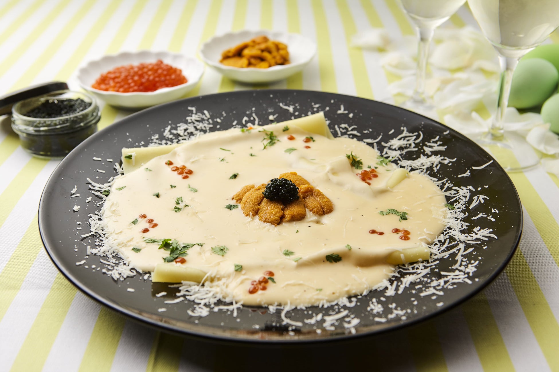 詳細:想像の斜め上を行く“巻かないパスタ”。キャビア・ウニ・イクラを贅沢に使い、クリームソース仕立てでご用意いたしました。シートパスタをナイフでカットしながらお召し上がりください。