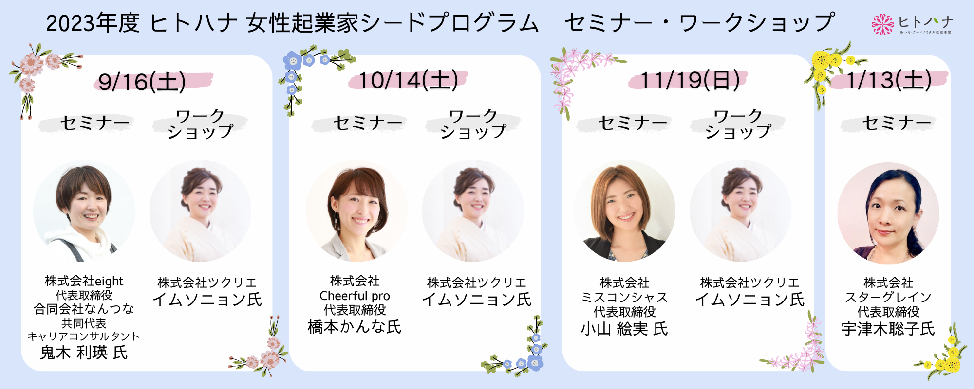 「2023年度 ヒトハナ 女性起業家シードプログラム」を2023年9月16日~2024年1月13日の期間で全4回開催します。