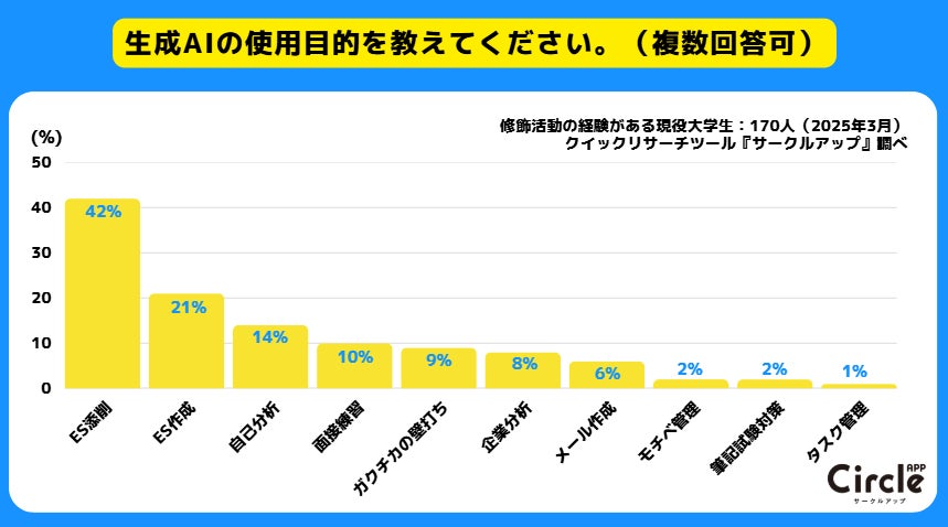 生成AIの使用目的として最も多かったのは「ESの添削」(42%)。次いで「ES作成」(21%)、「自己分析」(14%)、「面接練習」(10%)と、就活のさまざまな場面でAIが活躍していることがわかります。