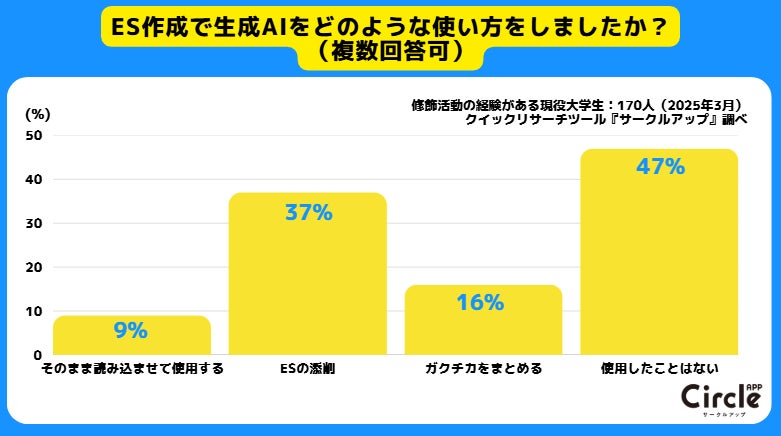 ES作成における具体的なAIの使い方を聞いたところ(複数回答可)、「ESの添削」が37%で最多。次いで「ガクチカをまとめる」が16%、「ES課題をそのまま読み込ませて使用する」はわずか9%にとどまりました。