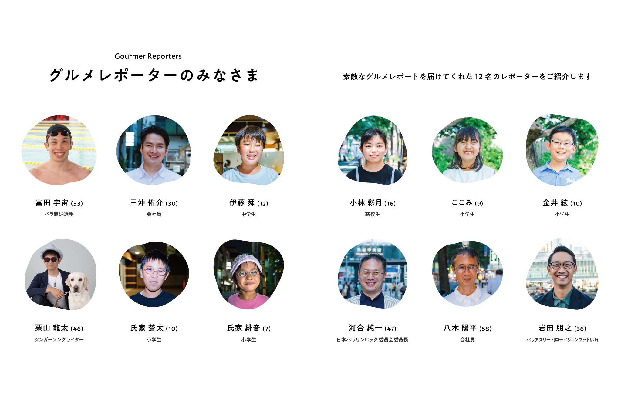 盲目のシンガーソングライター、グルメ好きな会社員、小学生YouTuber、東京パラ五輪メダリストなど、バックグラウンド豊かな12名の視覚障がい者が、グルメレポーターとして飲食店を取材しました。一人ひとりの食感覚を個性あふれる言葉で表現してくれました。