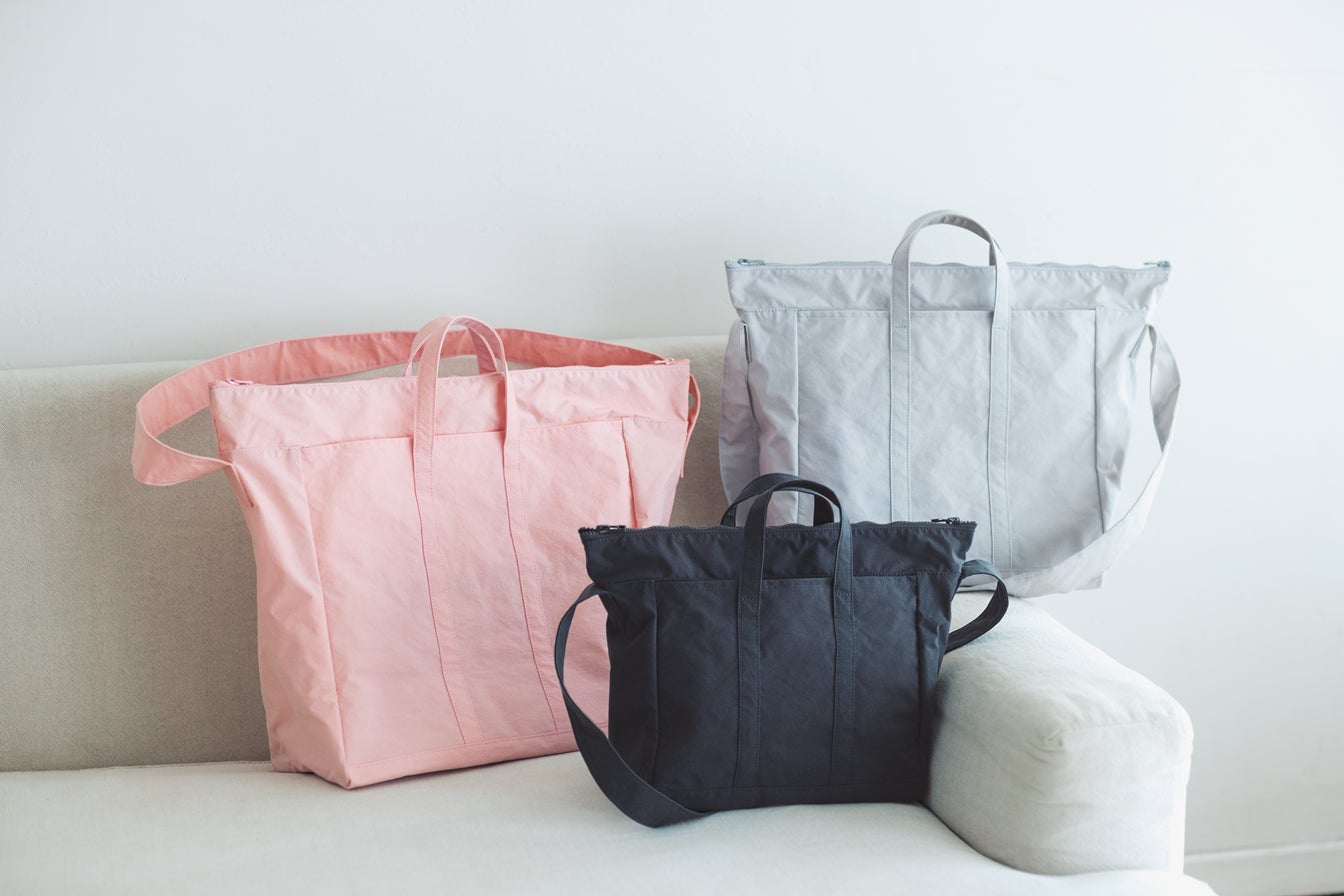 軽やかで、でも頼りになる様々なシーンで使えるオールマイティーなトートバッグです。とても軽いナイロン生地ですが、特殊な加工を施しているためハリがありポンと置いても自立します。本体には国産のナイロン生地を使用しており環境に配慮した染料による色つけをしています。撥水加工が施されており、多少の雨は弾くことができます。縫製は国内の職人さんによって1点1点お作りいただいています。3つのサイズ、3色展開なのでお使いのシーンやコーディネート、荷物の量などでお好みのバッグをお選びいただけます。