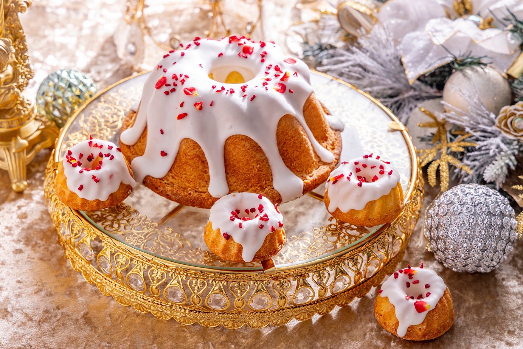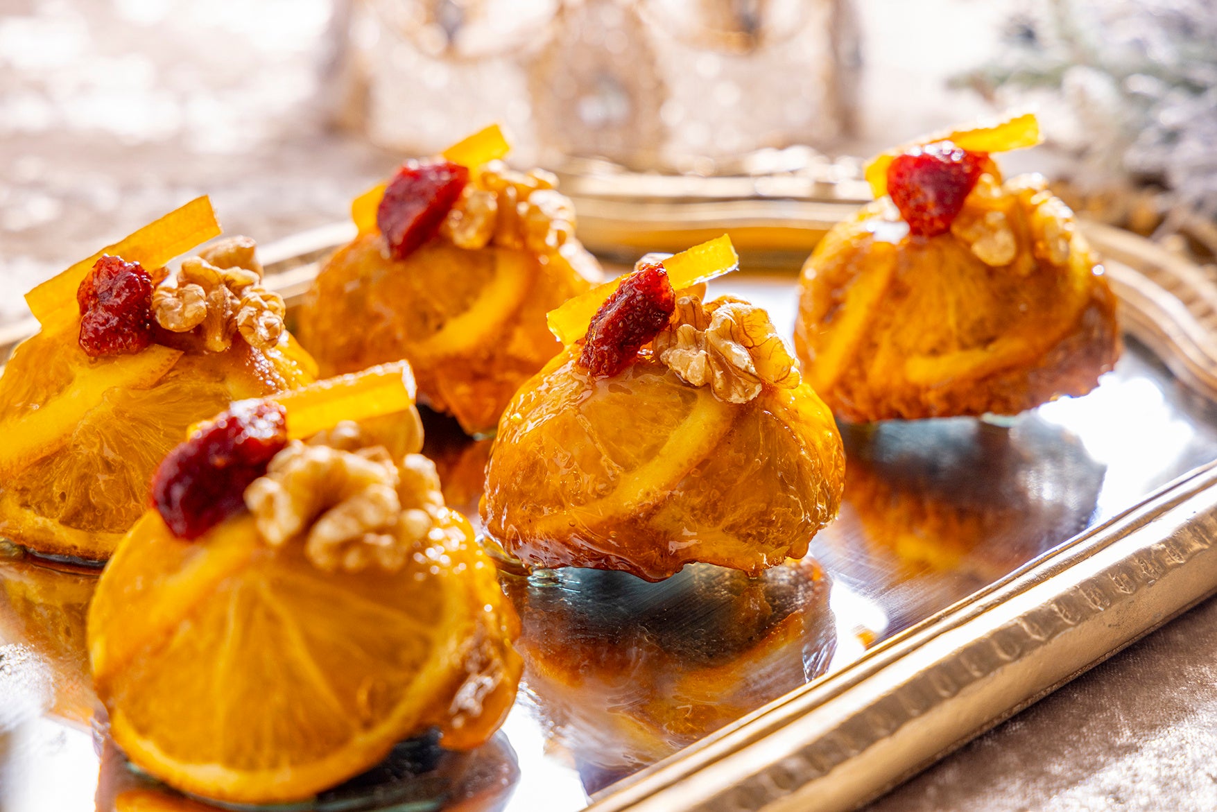 リキュールやドライフルーツを使用したクリスマスらしい焼き菓子も多数登場します。シナモンムースの中にラム酒風味のキャラメリゼバナナとブロンドチョコレートを配し、オレンジコンフィチュールとヘーゼルナッツローストを散りばめた「ロイヤルブッシュ・ド・ノエル」、洋梨のリキュール、ウィリアムポワールで漬け込んだオレンジ、レーズン、チェリーと共にしっとりと焼き上げる「プリンセスのクリスマスパウンドケーキ」、コニャックで漬けたデーツと胡桃、フレッシュオレンジで作るクリスマスプディング、「代々伝わるクリスマスオーナメント」など、ゆったりとご賞味いただけます。