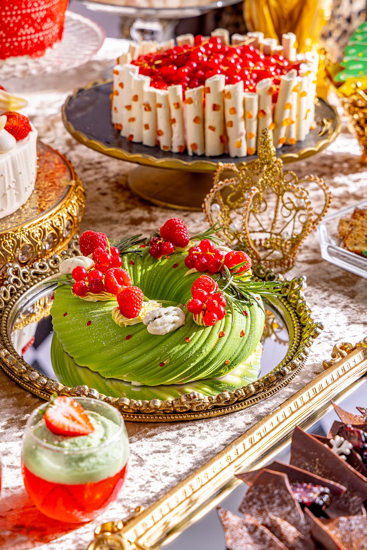 苺ムースとマスカルポーネムースの中にザクザク食感のホワイトチョコレートピーカンナッツを配し、苺、ブラックベリー、ブルーベリーをトッピングした「王妃のティアラ」はたっぷりのクリームとチョコレートで作るレースのアレンジが繊細な一品です。ピスタチオムースの中にローズマリーの香りを移したアプリコットとマンゴーのコンポートを忍ばせた「ロイヤルクリスマスリース」、パッションフルーツやライムのコンフィチュール入りホワイトチョコレートのムースにココナッツフレーバーのクリームとマシュマロをトッピングした「マジェスティック・ホワイト」、アーモンドをたっぷり用いたタルトの上にラズベリーと赤スグリのミルクチョコレートガナッシュを配し、シナモン風味のメレンゲを絞ったオーストリア名物リンツァートルテ風「クイーンズピロー」など華やいだクリスマスの雰囲気そのままのスイーツがビュッフェ台を彩ります。