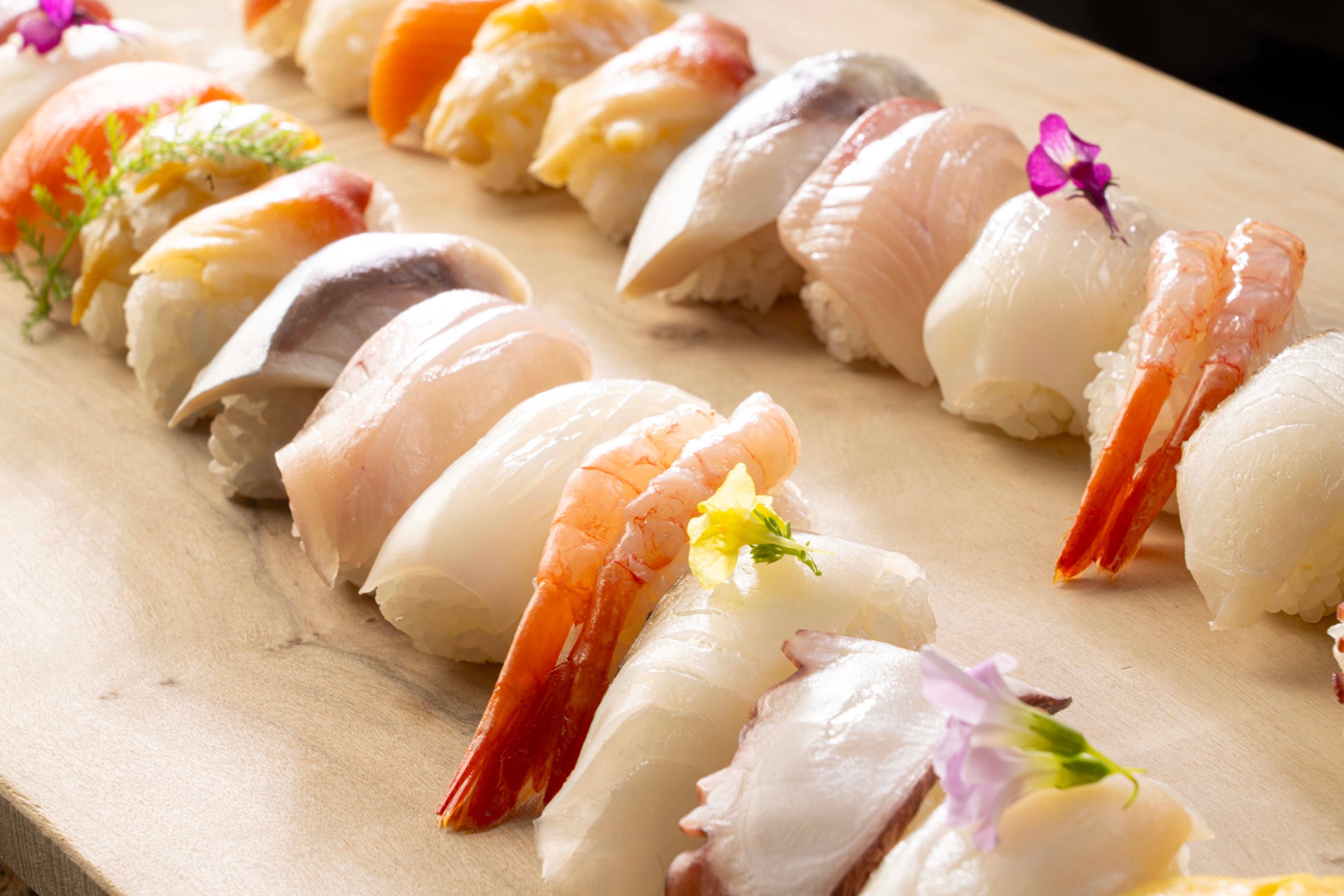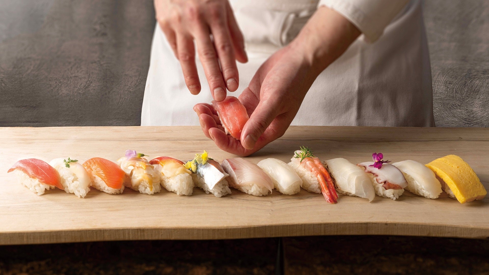 全13種類(甘エビ、烏賊、厚焼き玉子、マグロ、ブリ、トラウト、鯛、タコ、北寄貝、鱈昆布〆、鯖、ニシン炙り、つぶ貝)をご用意。職人が目の前で一貫ずつ丁寧に握り、お好みのネタを選ぶ楽しさとともに、北海道の海の恵みを存分にご堪能いただけます。