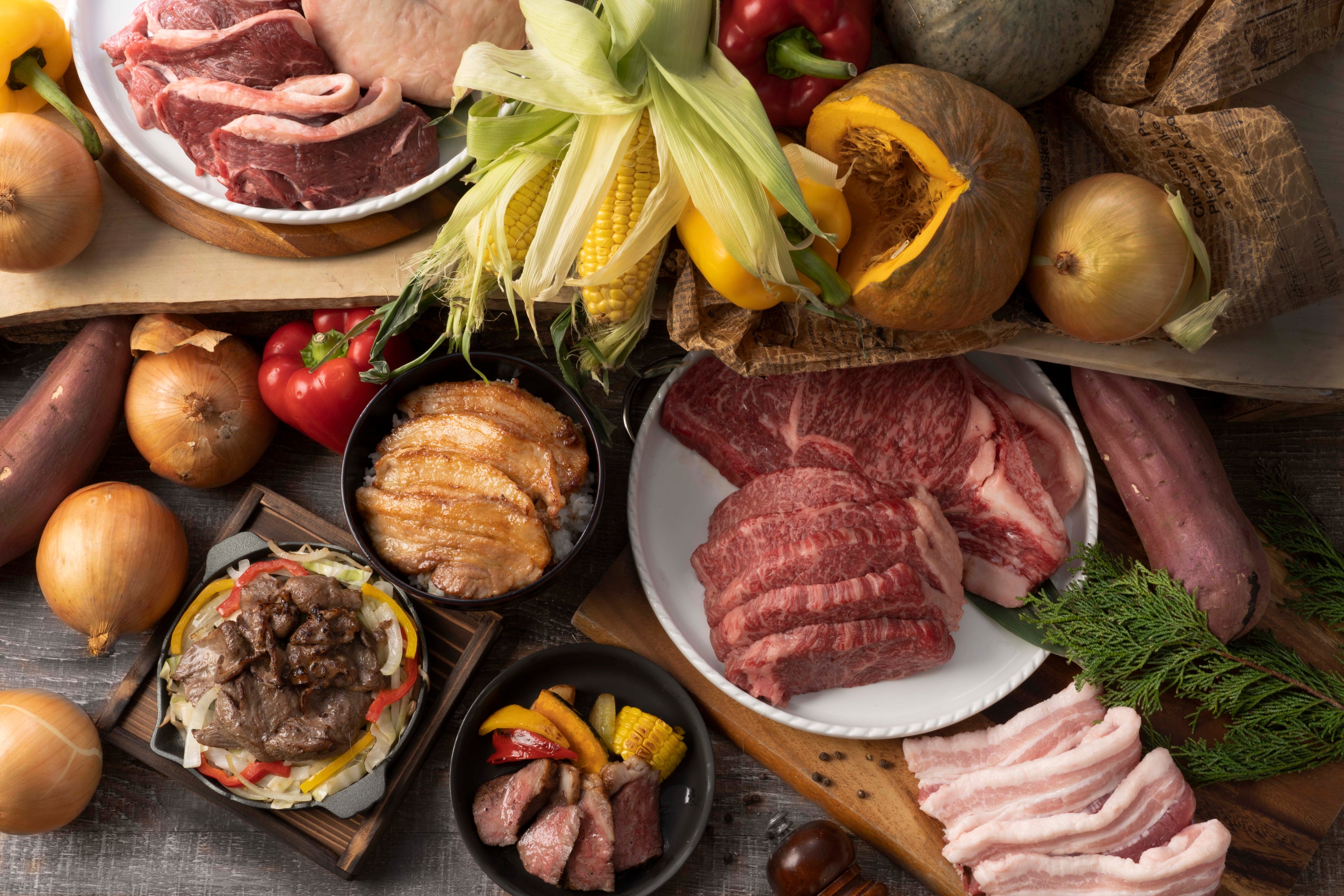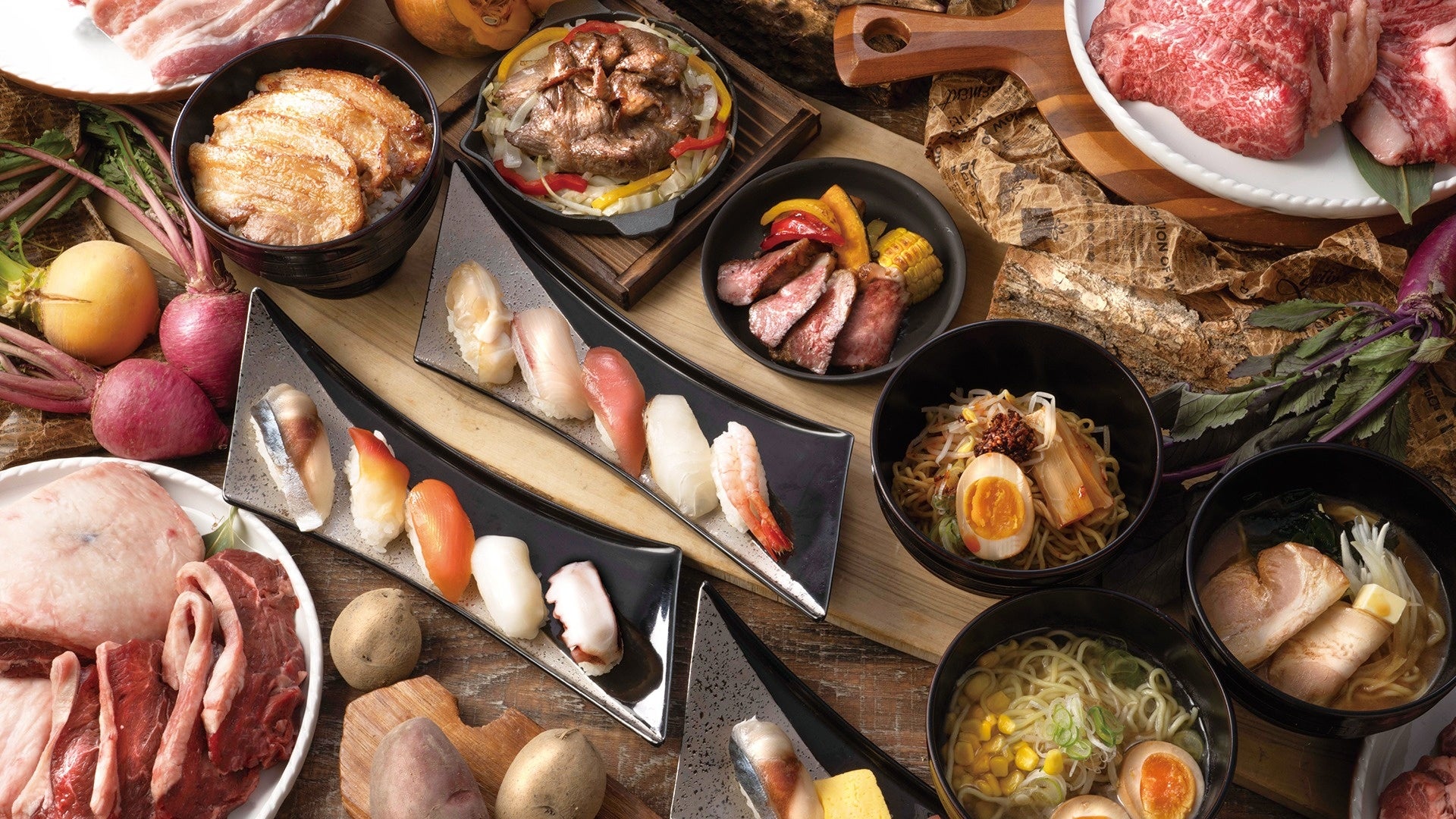 北海道名物ジンギスカンやビーフステーキは、お客様の目の前で焼き上げ、出来立ての状態でご提供いたします。ジンギスカン鍋や鉄板から立ち上る香りが、ライブキッチンならではの臨場感を演出します。十勝豚丼は、お客様ご自身で仕上げていただくスタイルとし、旅先ならではの楽しさも添えました。