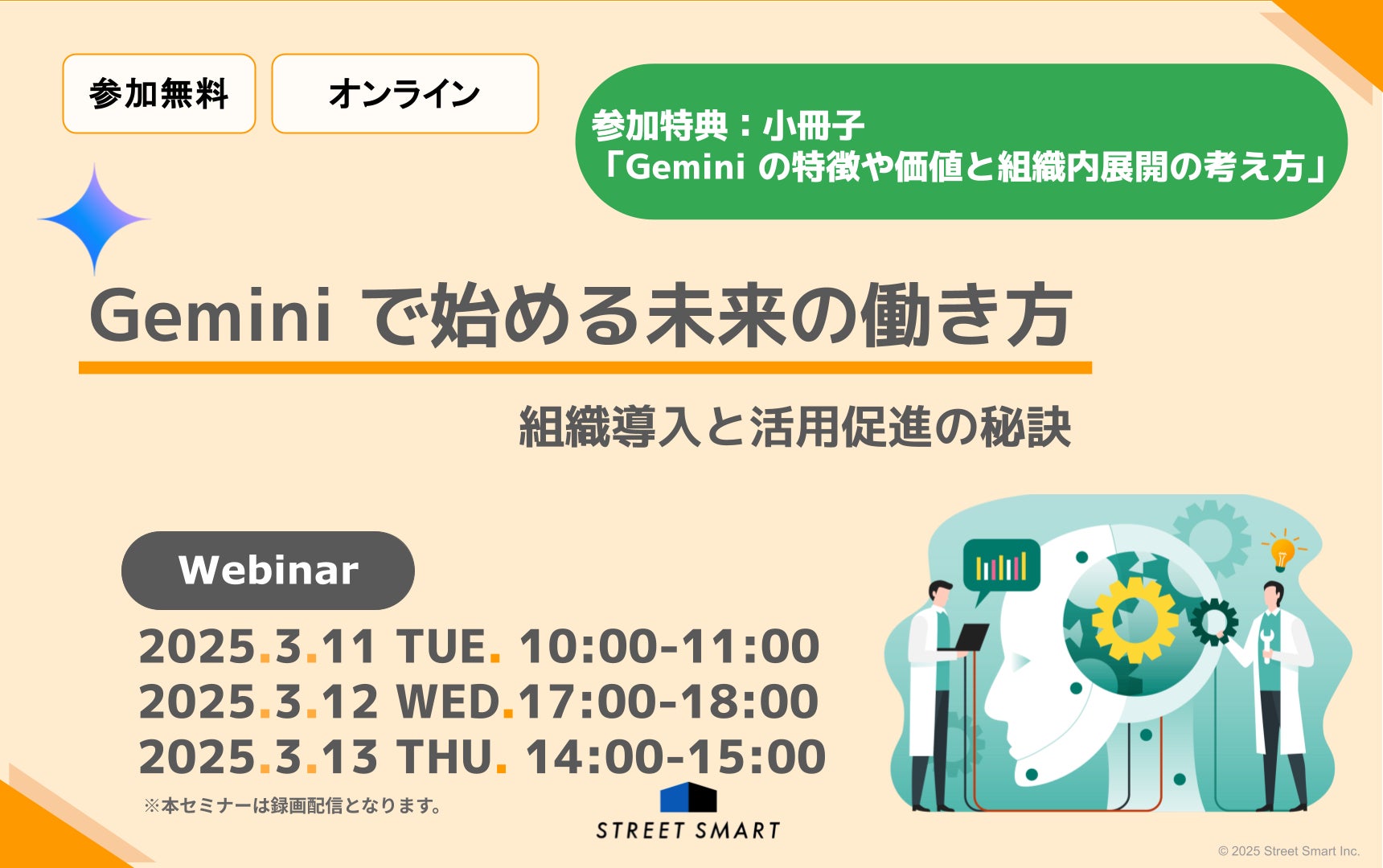 企業や教育機関のDXを支援する株式会社ストリートスマート(所在地:大阪府大阪市北区、代表取締役社長:松林大輔、以下:ストリートスマート)は、Gemini for Google Workspace で始める未来の叩き方についての無料セミナーを開催します。