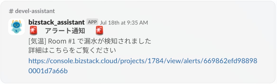 新機能のアラート受信は、ユーザーが「BizStack」 Console上で設定したしきい値を超えるデータや異常状態を「BizStack Assistant」経由でリアルタイムに通知する機能です。これにより、例えば温度や振動の異常、機器の故障など、重要な情報を即座に把握することができ、迅速な対応を可能にします。アラート通知はメールだけでなく、SlackやMicrosoft Teams、direct(ダイレクト)など、ユーザーが日常的に使用しているコミュニケーションツールでも受け取ることができるため、現場担当者がすぐに行動に移すことができます。