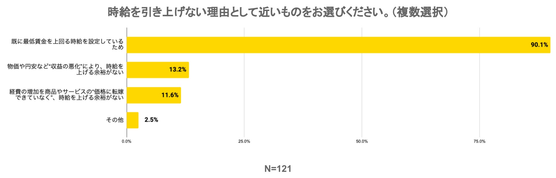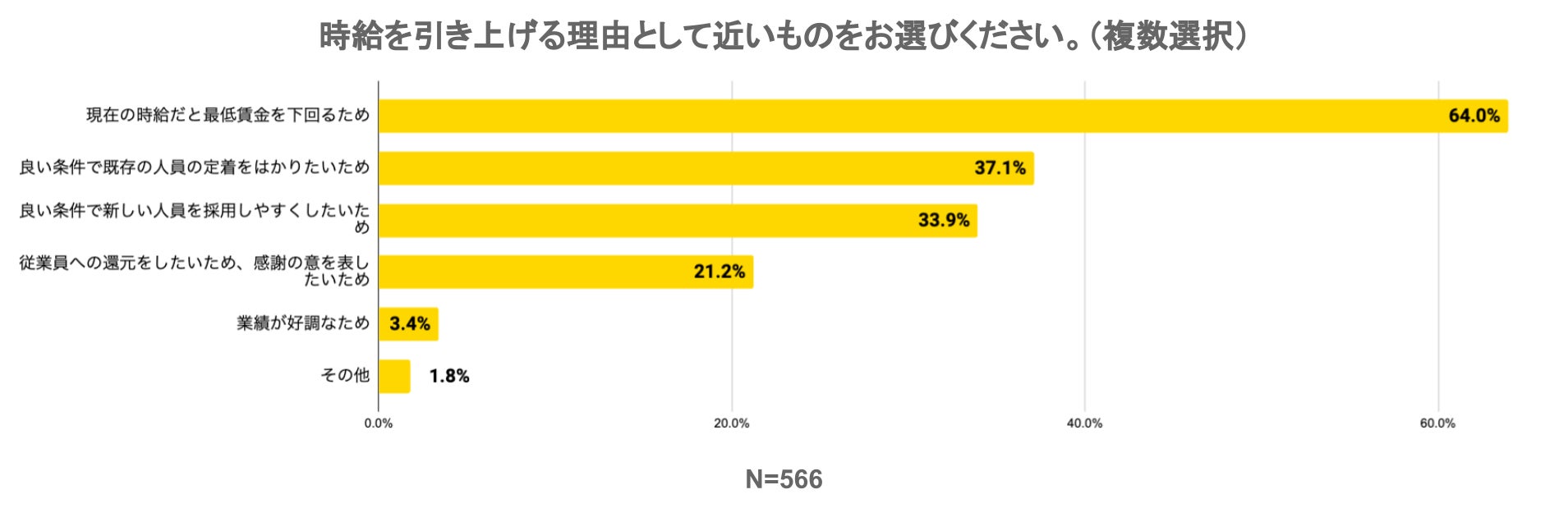 “時給を引き上げる”理由としては「現在の時給だと最賃を下回るため」という理由が最も多かったですが、「良い条件で既存の人員の定着をはかりたい」、「従業員への還元をしたいため」などの前向きな理由もありました。また、“時給を引き上げない”理由として多かったのは「既に最賃を上回る時給を設定している」という回答が90%を超えていました。