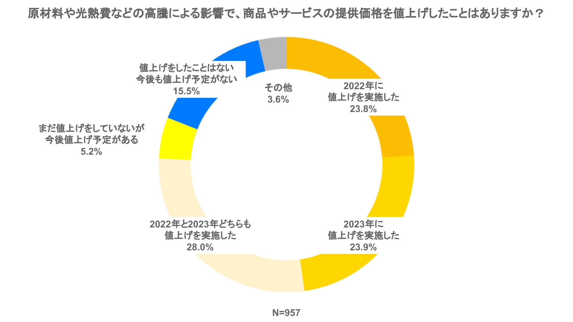 物価高の影響を受け、商品やサービスの提供価格の値上げについての設問では、“2022年に値上げを実施したことがある”、“2023年に値上げを実施したことがある”、“2022年、2023年どちらも値上げを実施したことがある”と回答した事業者を合わせると、約76%いることがわかりました。