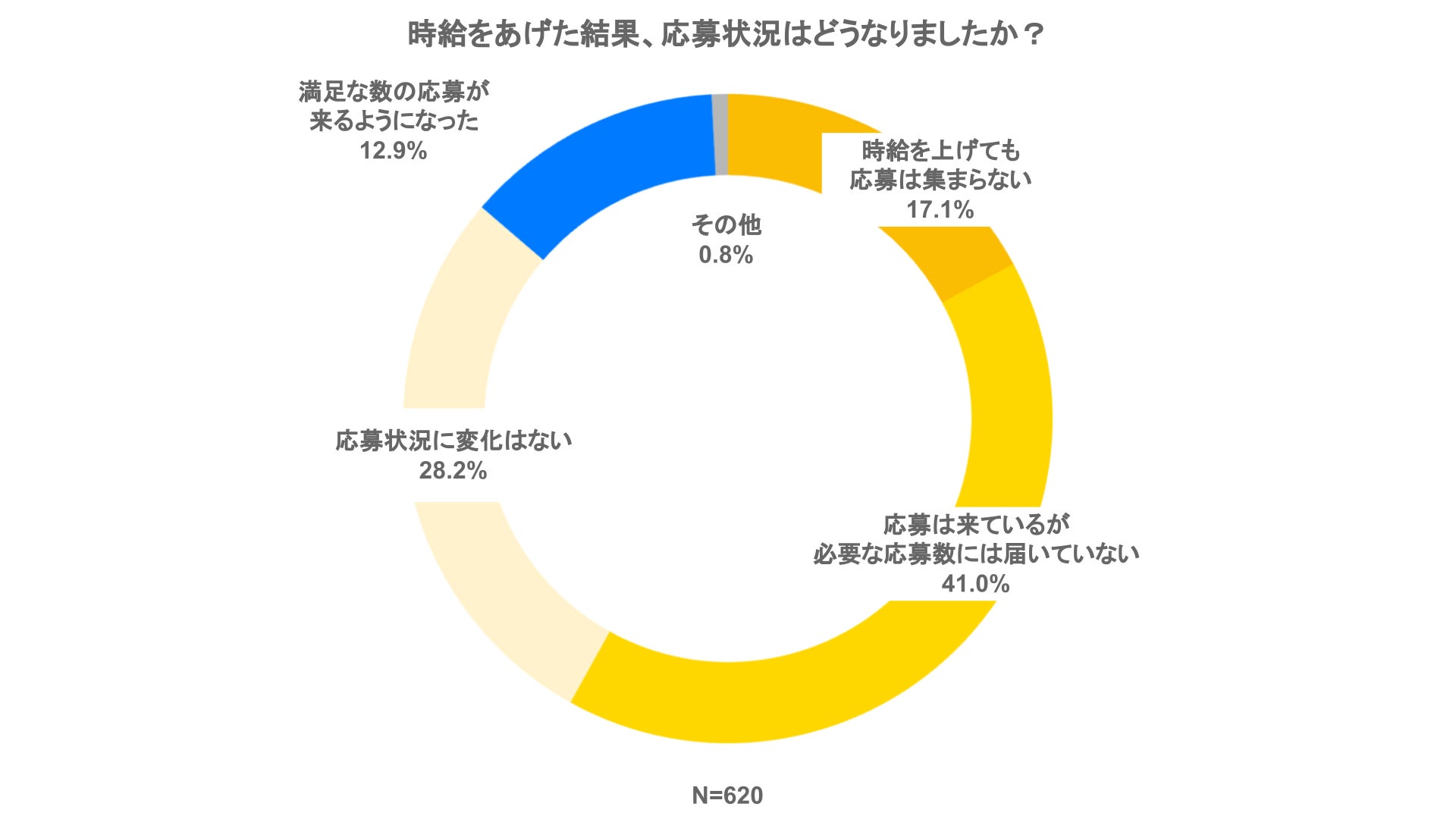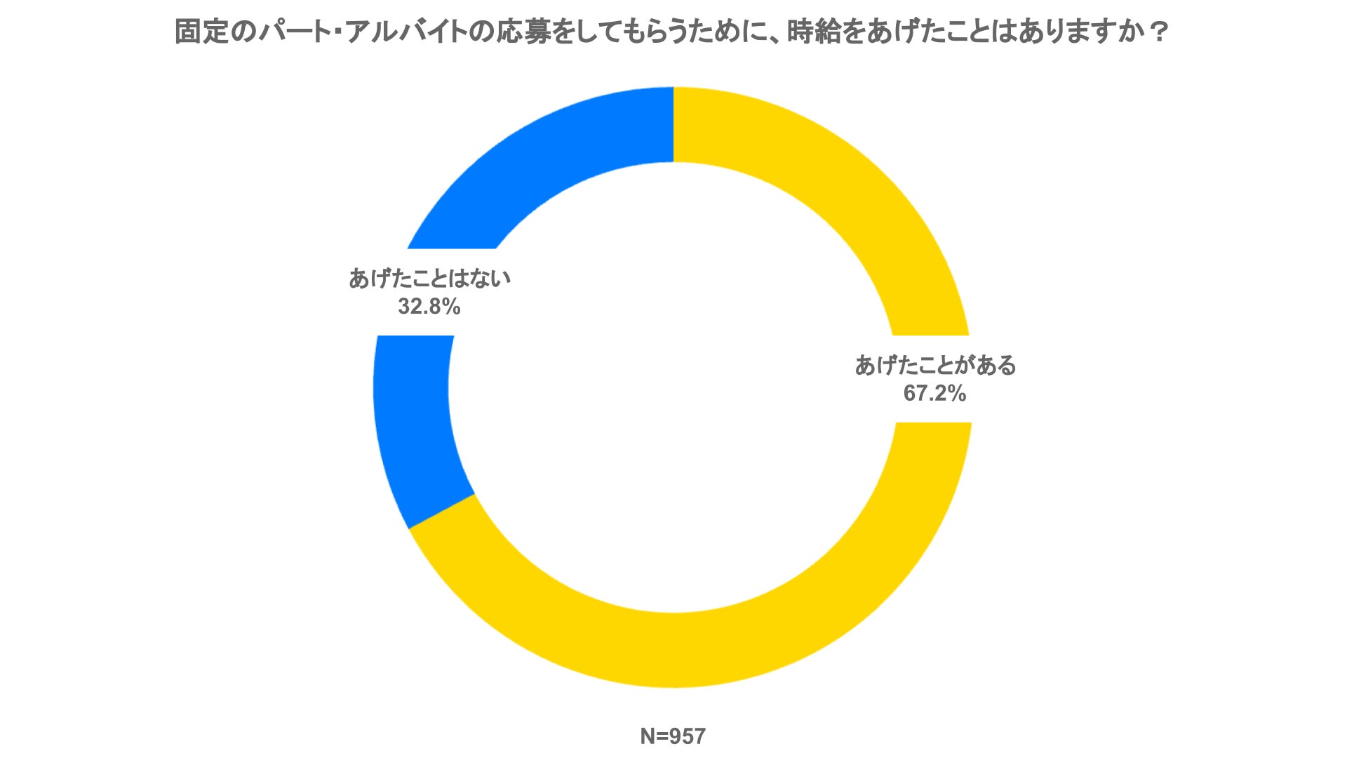 “固定のパート・アルバイトの応募をしてもらうために、時給をあげたことがあるか”という設問に対しては、時給をあげたことがある事業者が約67%いることがわかりました。しかし、“時給を上げても応募が集まらない”、“必要な応募数に届いていない”などの課題感を引き続き感じている事業者が約58%いることもわかりました。