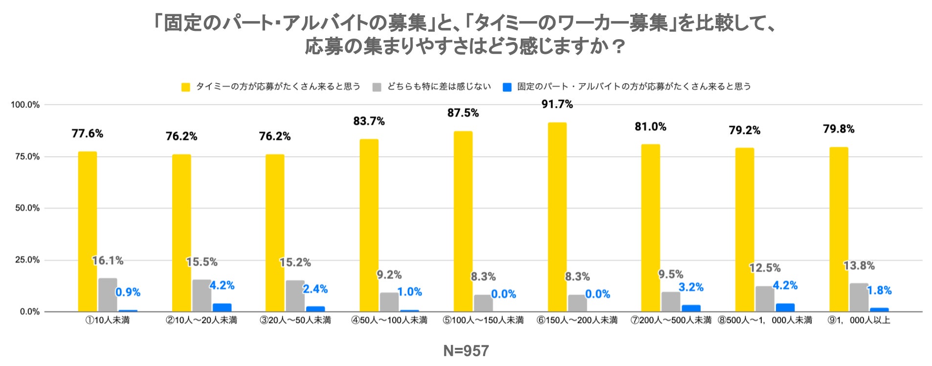●一方で、“タイミーでのワーカー募集の方が応募がたくさん来ると感じている事業者”が75%以上いるなど、人手不足の課題感にスキマバイトが活用されている実態が明らかになりました。