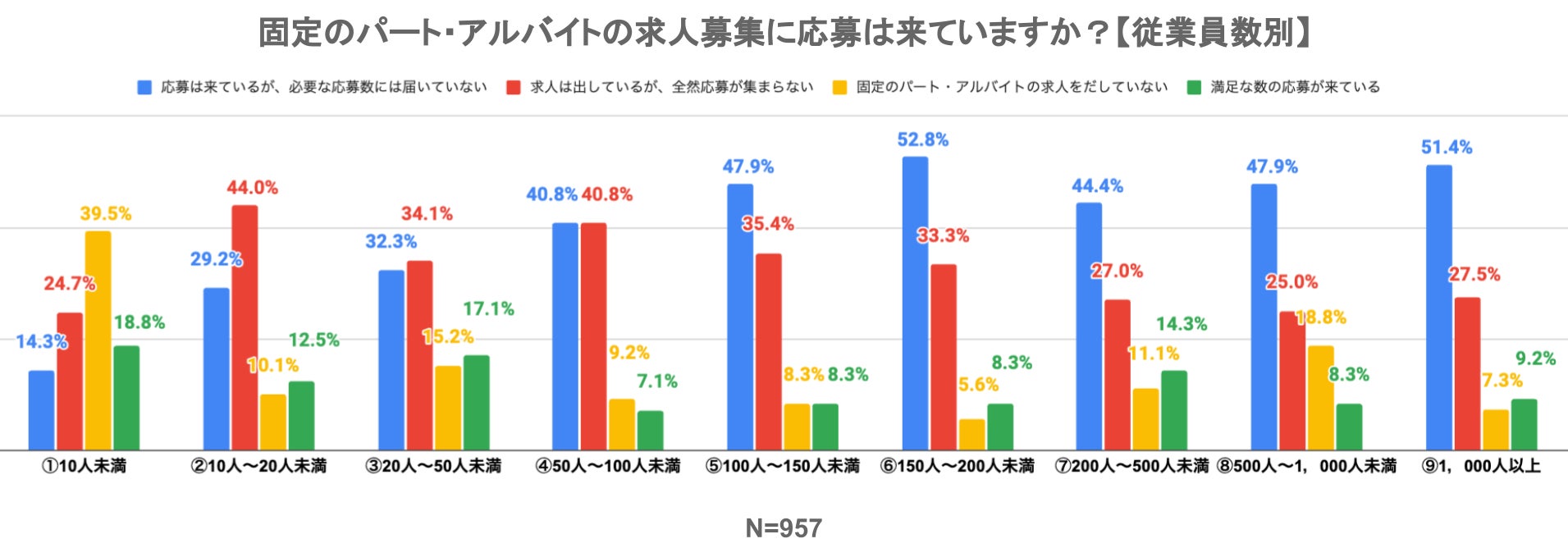 固定のパート・アルバイトの求人募集への応募状況についての回答を企業規模(従業員数別)で見てみると、10人未満の事業者以外は、総じて応募状況に課題感があることがわかり、50人〜200人未満の事業者はいずれも「応募は来ているが、必要な応募数には届いていない」「求人は出しているが、全然応募が集まらない」の合計が80%を超えるなど課題感が大きい様子が伺えました。