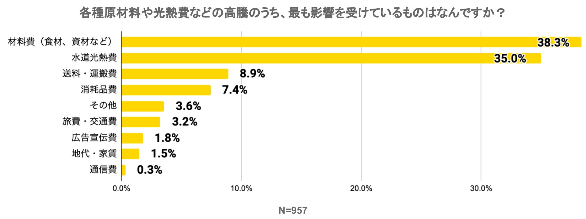 最も影響を受けている費目は、“材料費”、“水道光熱費”がいずれも35%を超えるなど回答が集中しました。