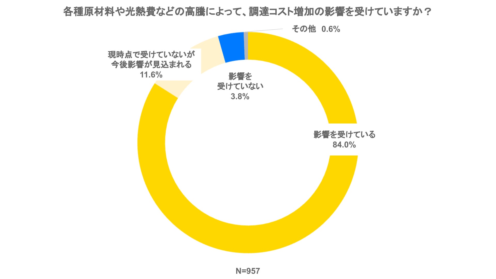 なお、2022年より続いている原材料や光熱費などの高騰・物価高による調達コスト増加の影響については、“影響を受けている”事業者が約84%いました。