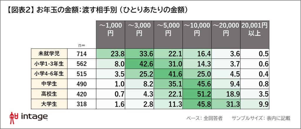 続いて、渡す相手別の相場(ひとりあたりの金額)を見てみましょう。未就学児では過半数が3,000円以下、小学生では、1-3年生、小学4-6年生ではそれぞれ、1,000円超~3,000円(43%)、3,000円超~5,000円(42%)が最も多く、中学生以上では、5,000円超~10,000円がいずれも約5割と最も多い結果でした。大学生では10,000円超から20,000円を想定している人も3割存在していました。【図表2】