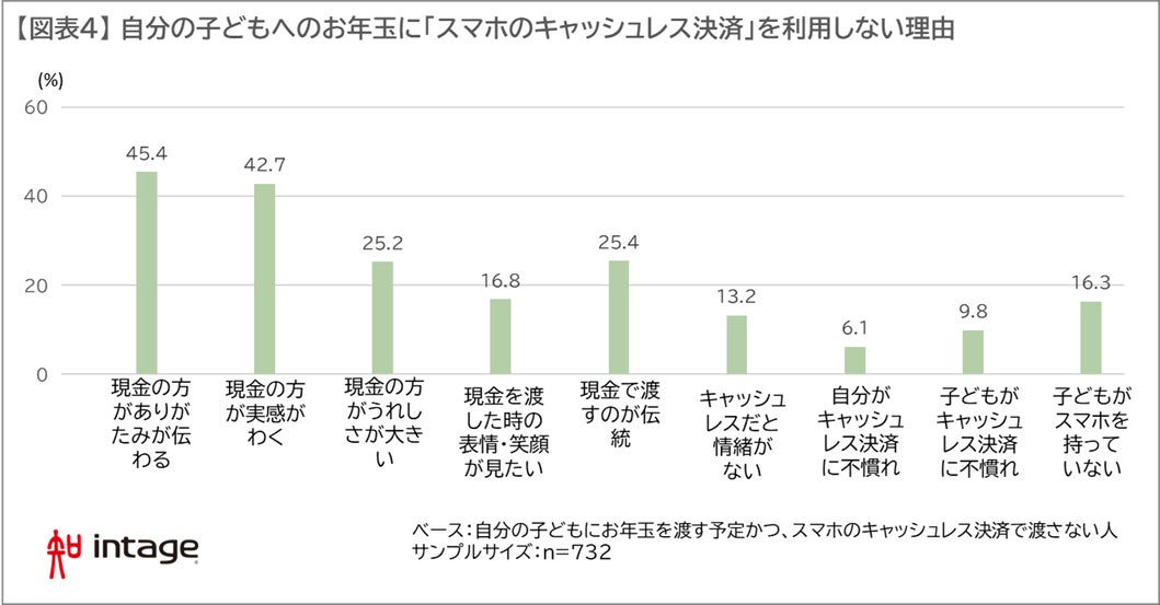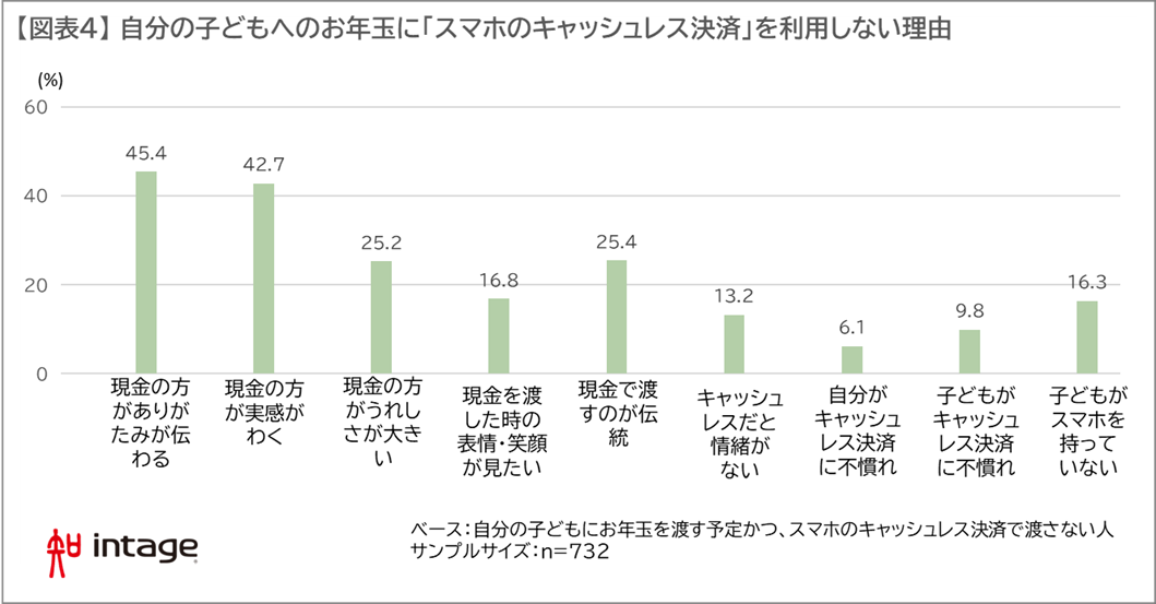 キャッシュレス決済が進んでも、お年玉は現金での手渡し派が圧倒的に多い背景に、どういった理由があるのでしょうか。最も多くの人が挙げた理由は「現金の方がありがたみが伝わる」「現金の方がもらったという実感がわく」で、いずれも40%超の回答を集めました。次いで、「現金の方がうれしさが大きい」「現金で渡すのが伝統」も、それぞれ4人に1人が理由として回答。お正月という伝統行事に紐づいた風習であるお年玉に関しては、従来通りの渡し方を大切に思う人が多いことが明らかになりました。【図表4】