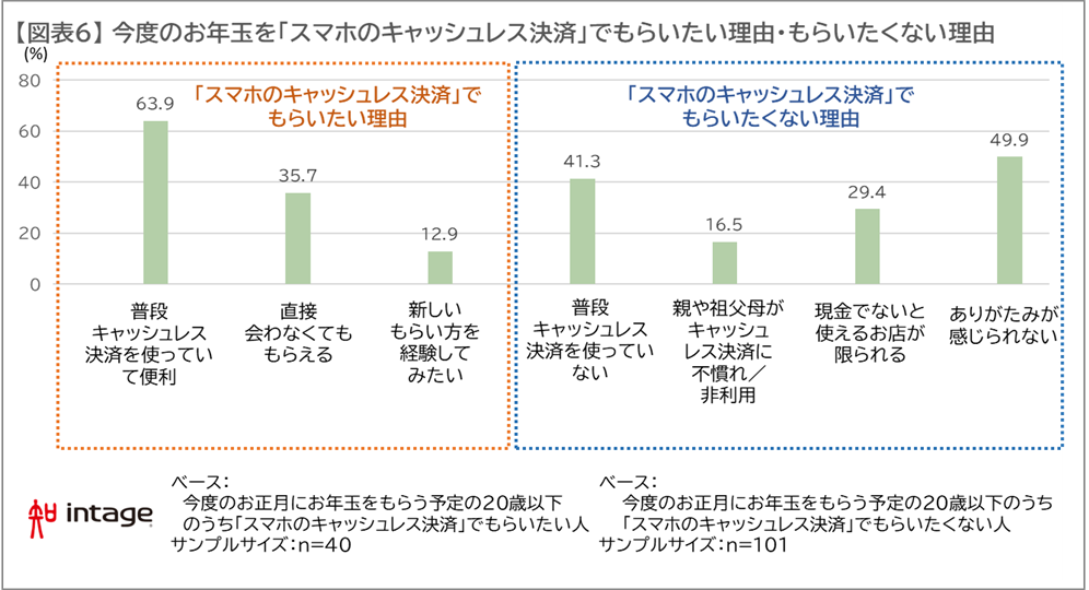 では逆に、お年玉をもらう側の若者はどう思っているのでしょうか。20歳以下の人に、お年玉をキャッシュレス決済でもらいたいか、そしてその理由をたずねました。「キャッシュレス決済でもらいたい」という人は29%でした。その人たちの主な理由は、「普段キャッシュレス決済を使っていて便利」(64%)でした。一方、7割を占めた「キャッシュレス決済でもらいたくない」人の半数が挙げた理由は「ありがたみが感じられない」でした。【図表5】【図表6】