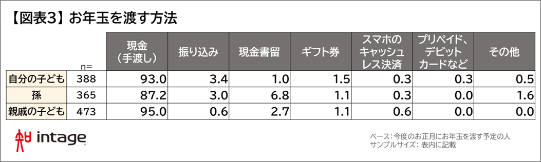 キャッシュレス決済が急速に浸透している昨今、お年玉を渡す方法としてどれくらい活用されているのかを見てみましょう。渡す相手が、自分の子ども、孫、親戚の子ども、いずれの場合も、「現金での手渡し」という人がほとんどで、「スマホのキャッシュレス決済」という人は1%にも満たない結果となりました。手渡し以外の方法としては、キャッシュレス決済より、「現金書留」や「振り込み」の方が多いのが現状ということがわかりました。【図表3】