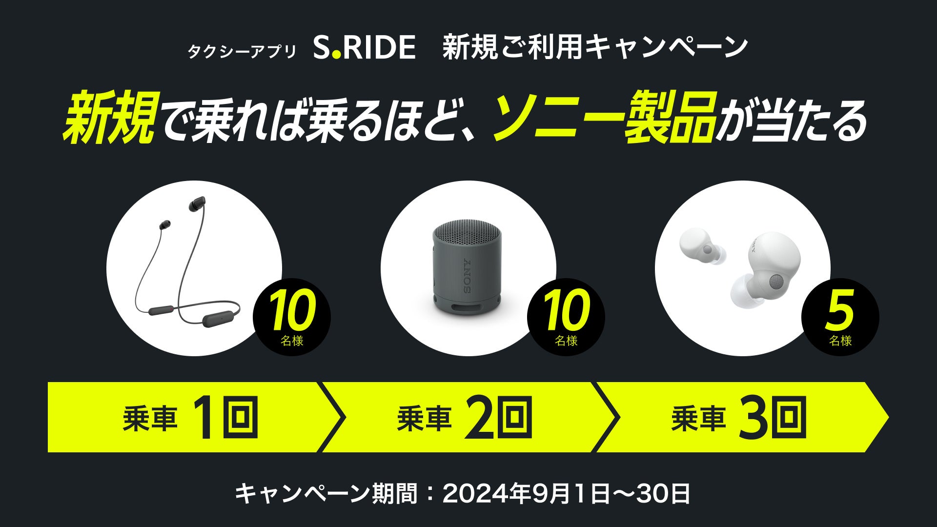 9月1日(日)より、「S.RIDE」アプリを初めてご利用される方向けに、ソニー製品が当たるプレゼントキャンペーンを実施します。キャンペーン期間中、「S.RIDE」アプリからの配車および予約のご利用回数に応じて、ソニー製完全ワイヤレス型ヘッドホンやワイヤレスポータブルスピーカーなどを抽選でプレゼントします。