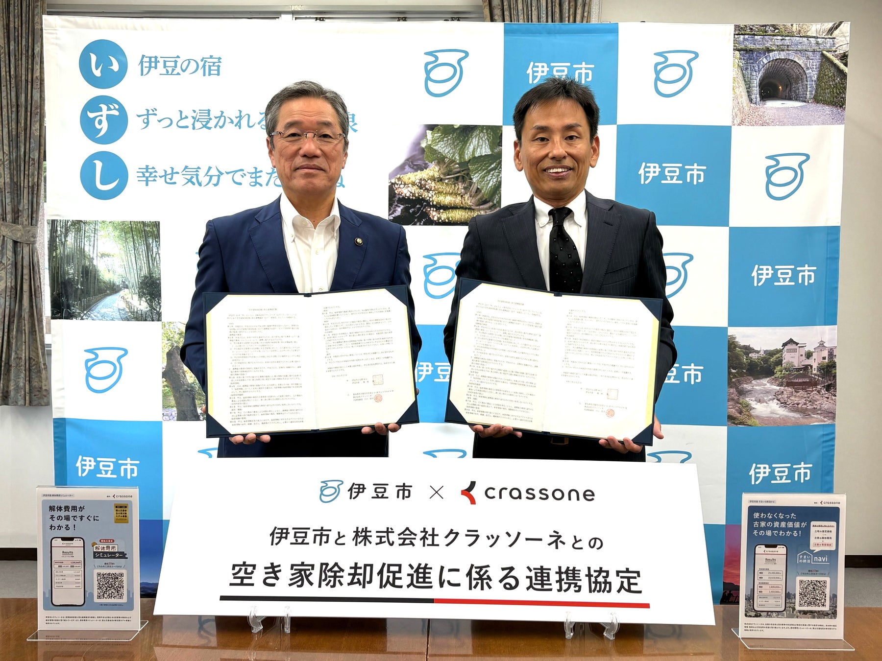 解体工事DXプラットフォーム「クラッソーネ」を運営する株式会社クラッソーネ(愛知県名古屋市、代表取締役CEO:川口 哲平、以下「当社」)は、静岡県伊豆市(以下、「伊豆市」)と「空き家除却促進に係る連携協定」を締結いたしました。昨今、全国的にも社会課題となっている空き家問題への対策として、伊豆市の空き家除却を推進することで、安全安心なまちづくりを目指します。また本締結で、当社の自治体連携の実績は125自治体(行政運営の団体含む)となり、全国での人口カバー率は18.1%、静岡県内では5.7%となりました(※1)。