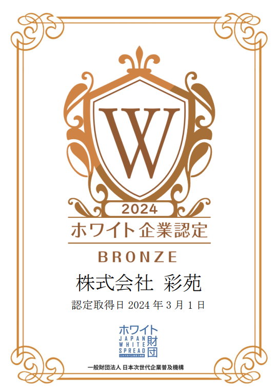 株式会社彩苑が、一般財団法人日本次世代企業普及機構(通称:ホワイト財団)が運営する「ホワイト企業認定 ブロンズランク」を取得したことをお知らせいたします。