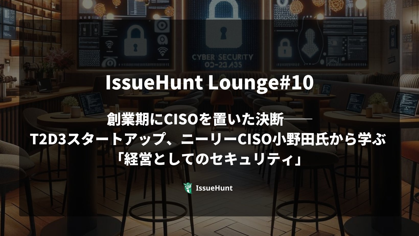 IssueHuntが不定期開催しているプロダクトセキュリティに関するクローズドなコミュニティイベント「IssueHunt Lounge」の第10回目として、『創業期にCISOを置いた決断──T2D3スタートアップ、ニーリーCISO⼩野⽥⽒から学ぶ 「経営としてのセキュリティ」』を開催いたします。