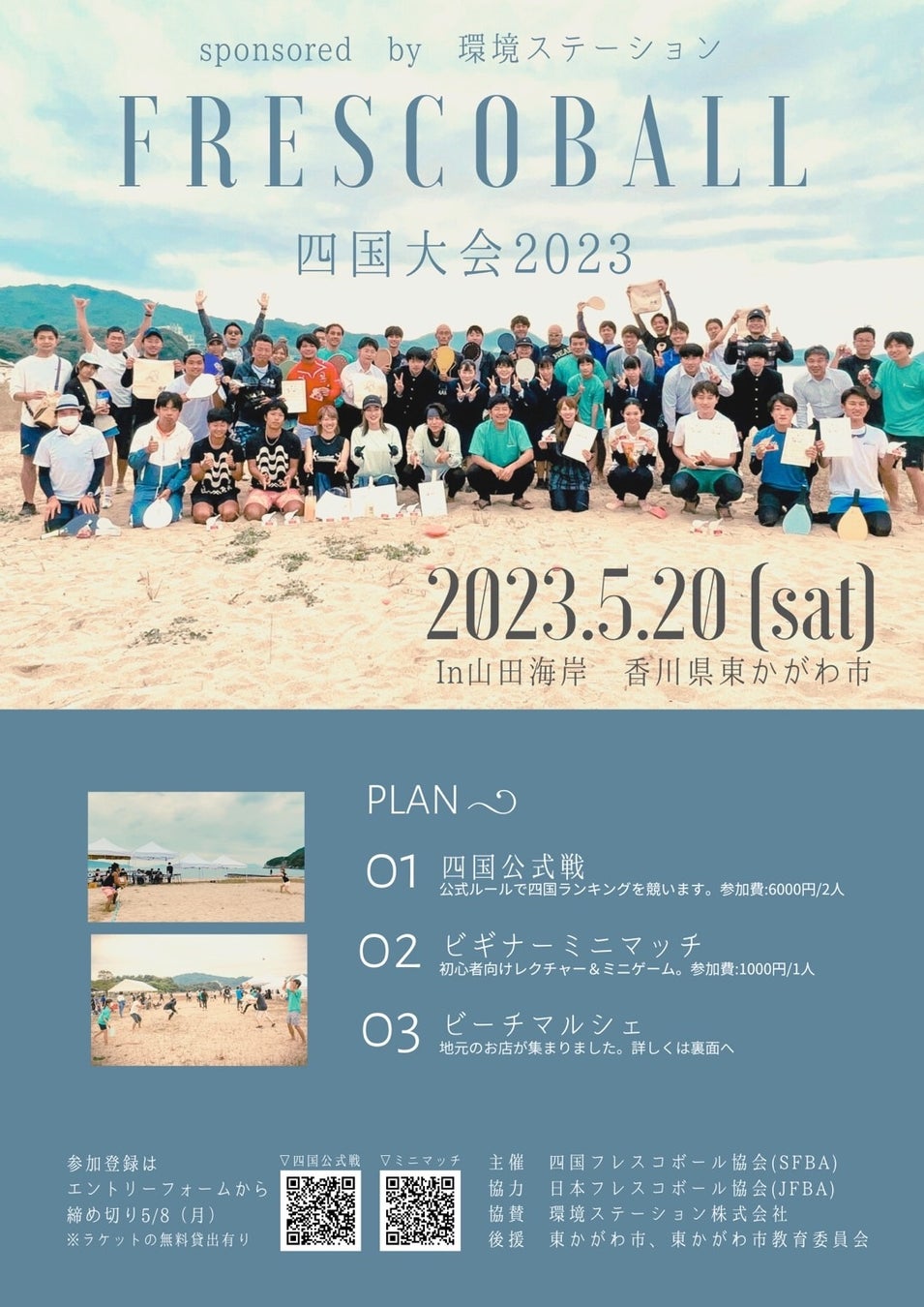 昨年に続き、東かがわ市・山田海岸を舞台に、四国No.1ペアを決める公式戦が開催されます。イベント内容は、四国内ランキングが決定する「公式戦」に加えて、フレスコボール初心者が楽しめるミニゲームを含めた「ビギナーマッチ」も開かれるなど、トップ選手からエントリー層まで裾野を広げた大会に。地域密着の活動も盛んな「四国フレスコボール協会(以下SFBA)」らしい充実の一日となりそうです。