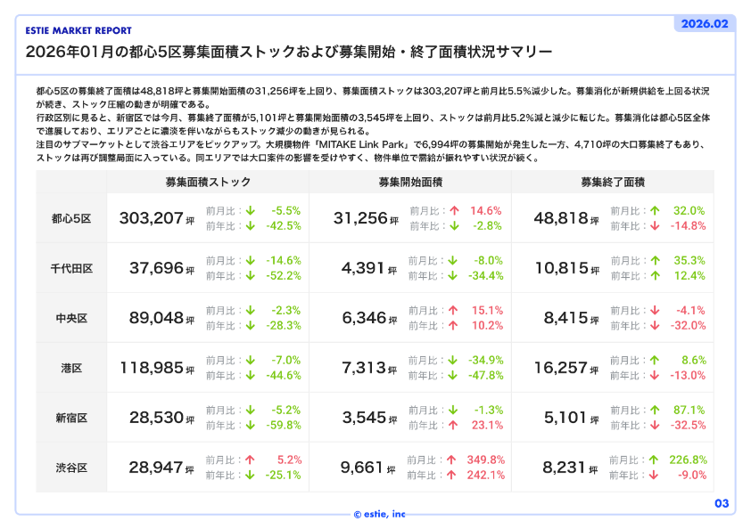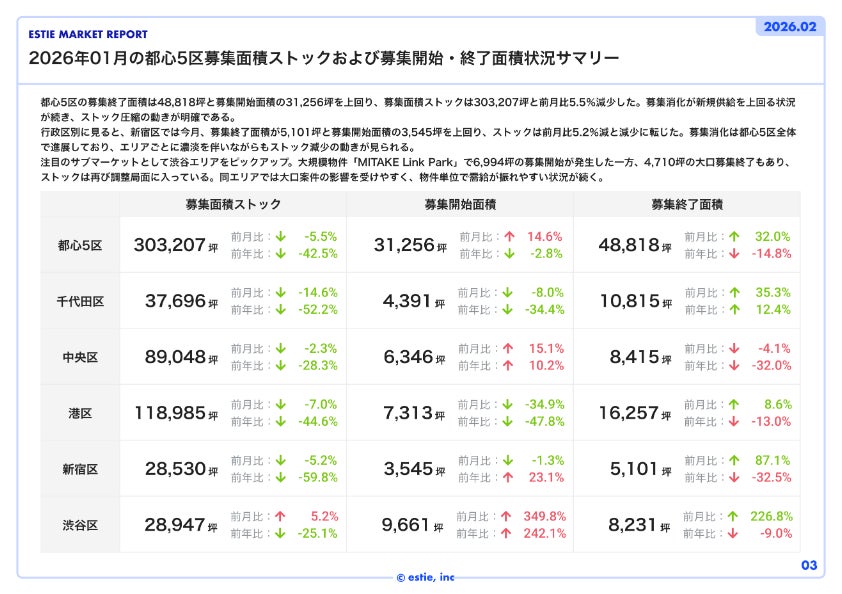 2026年1月の都心5区全体では、募集開始面積は前月比14.6%増の31,256坪、募集終了面積は前月比32.0%増の48,818坪となり、募集終了面積が募集開始面積を上回りました。募集面積ストックは前月比5.5%減の303,207坪となり、募集消化が新規供給を上回る状況が続き、ストック圧縮の傾向にあります。