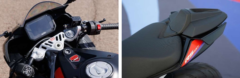 ライディングポジションは、ステアリングトップブリッジの上に取り付けられたセパレートハンドルバーと、低めにセ ットされたステップにより、スポーティなポジションでありながら街乗りでの快適性を完璧にバランスさせていま す。燃料タンクの形状もライダーの胸部とヘルメットにフィットするようにデザインされており、バイクとの完璧な一 体感に貢献しています。そのため、いかなる身長のライダーであっても、最大限のコントロール性とリラックスした ポジションを提供します。 RS 457 のスポーティでダイナミックなボディラインは、2 in 1 エキゾーストの取り回しにも大きく影響しており、エ ンジン下部のサイレンサーはアンダーカウルと一体化しているかの様に美しく収められています。これによりバイ ク後部のデザインに自由度が増し、リアステップブラケットの位置を適切に配置できるようになりました。 わずか 800 mm の低いシートは、地面にしっかりと足がつくように細い形状となっています。洗練されたテール フェアリングには LED リアライトユニットが組み込まれ、側面の 2 つのウィングレット形状のグラブハンドルが特 徴的です。広いパッセンジャーシートは、アクセサリー(別売り)のシングルシートカウルに交換が可能です。