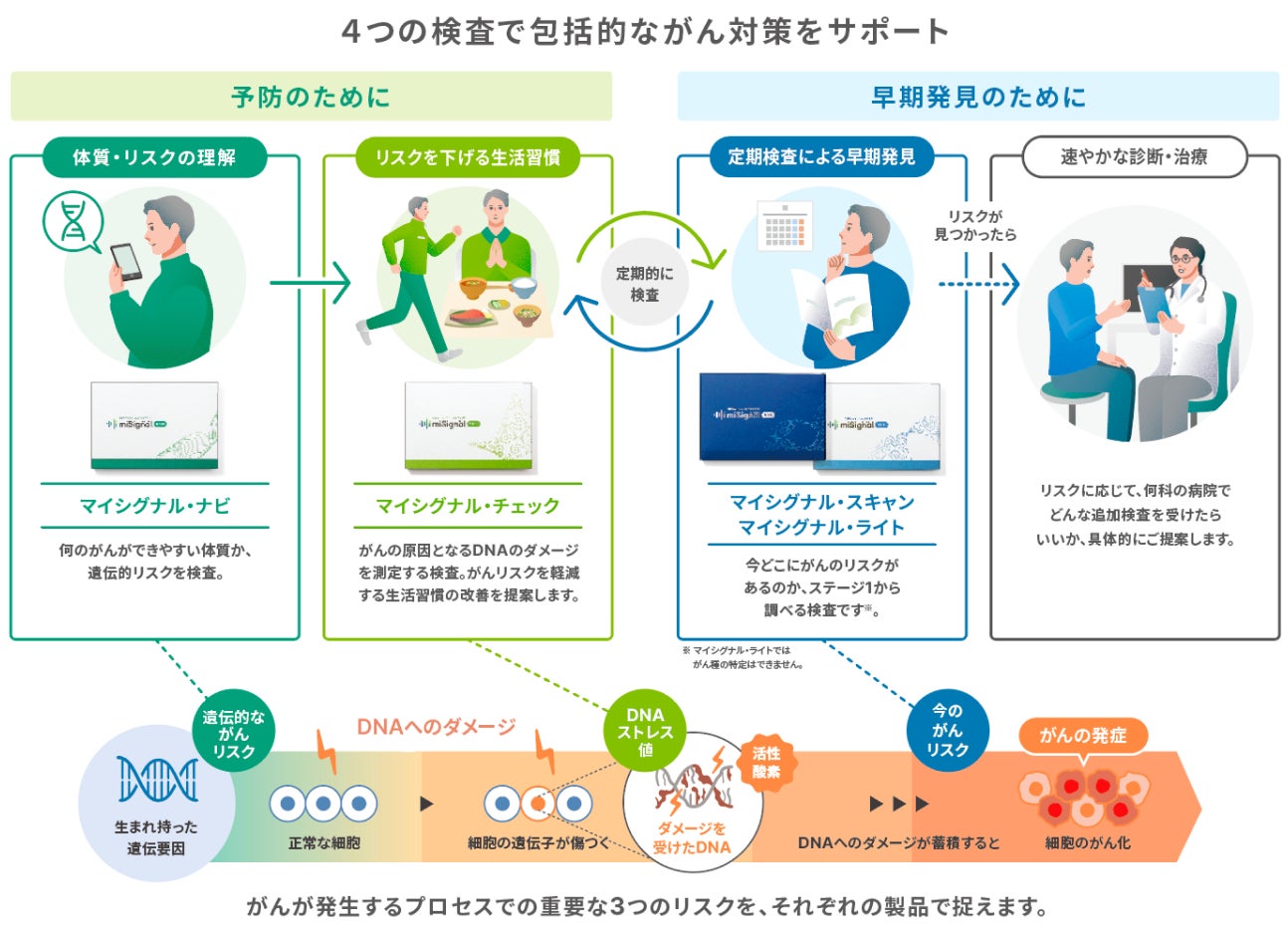 がんは長年に渡る生活の中でDNAにダメージが蓄積し、ある日突然発症する病気です。そのため、一度の検査で完結する「点」の発想ではなく、連続的な「線」で対策することが重要です。「マイシグナルシリーズ」は「線」のアプローチによるがん対策を、尿や唾液を提出するだけの簡便な検査で実現した革新的なサービスです。4つの検査を通じて、自らの体質的なリスクを知り、日々のDNAのダメージをモニタリングすることで発症を予防し、それでも防ぎきれないがんを早期発見することを一気通貫でサポートし、誰もが気軽に検査を受け、がんの予防と早期発見を促進することを目指しています。