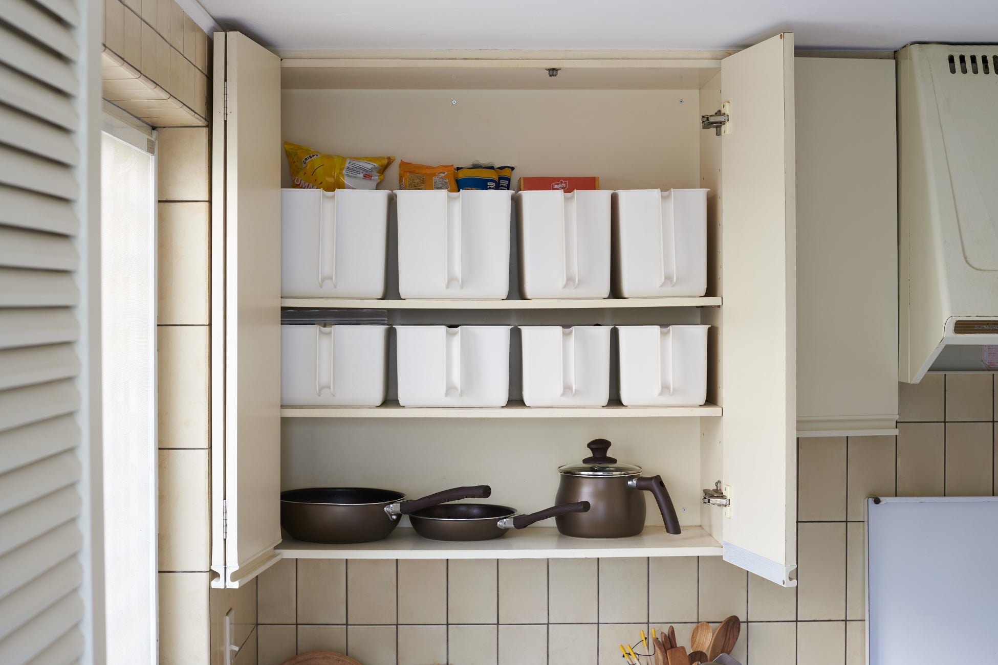 背が高いビンなどの備蓄品はもちろん、コーヒーやティーアイテムを食材と一緒にセットにしてしまっておくのもおすすめです。来客時にぱっと取り出せて便利です。