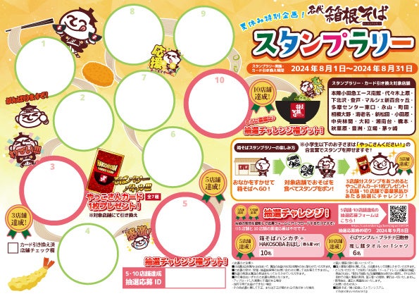 株式会社小田急レストランシステム(本社:東京都渋谷区 代表取締役社長:深海尚)は、2024年8月1日(木)から8月31日(土)まで、小田急線沿線を中心に展開するスタンドそば店「箱根そば本陣」および「箱根そば」において、「夏休み特別企画!箱根そばスタンプラリー」を実施いたします。