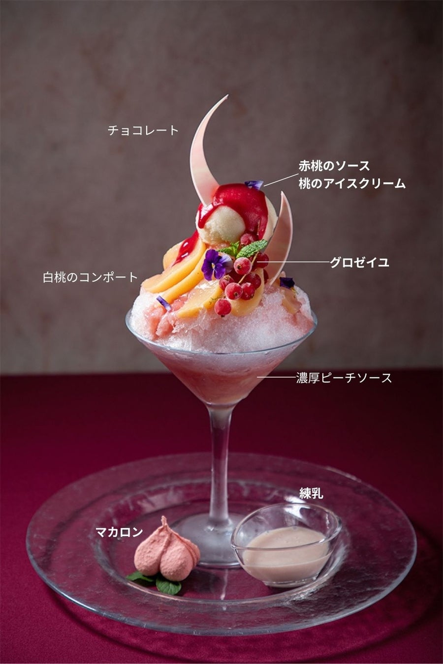 福島県産の桃のゴロゴロとした食感が楽しめる濃厚ピーチソースの上に頭がキーンとしない純氷と、白桃のコンポート、桃のアイスクリーム、赤桃のソースをかけた上品で贅沢な仕上がりの「桃のかき氷」。お食事やドリンクの後でも最後まで飽きることなくお楽しみいただけるよう、口直しの“マカロン”と味に変化を加える“練乳”を添えました。