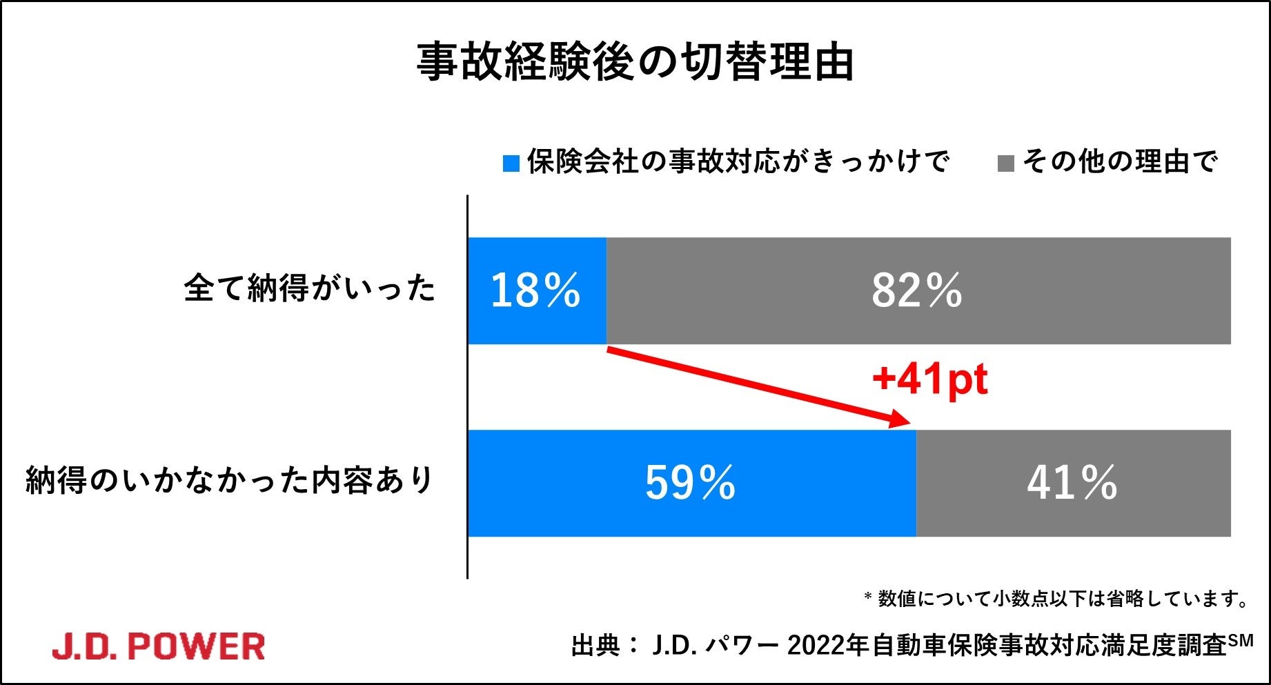事故経験後、他の保険会社への切り替え理由が「保険会社の事故対応がきっかけで」とある割合は、「納得のいかなかった内容あり」の顧客では59%、「全て納得がいった」顧客では18%と大きな開きが見られ、保険金支払の納得感が継続意向に大きく影響していることがわかる。