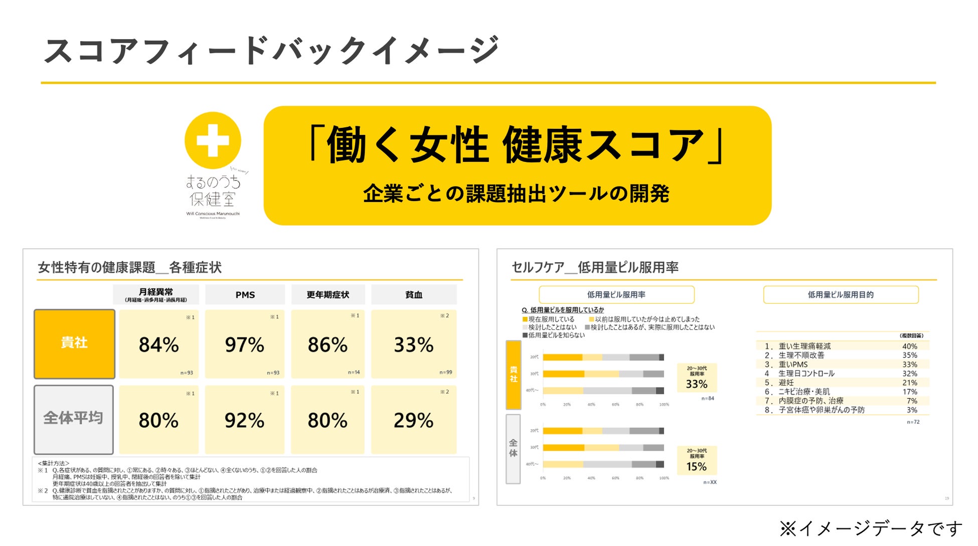「まるのうち保健室」から、働く女性の健康実態を調査し改善に活かすアクションの1つとして「働く女性 健康スコア」をスタートします。企業やコミュニティごとの働く女性が抱える健康課題を明らかにし、これまで数値化しづらかった領域をスコアとして表現する試みです。