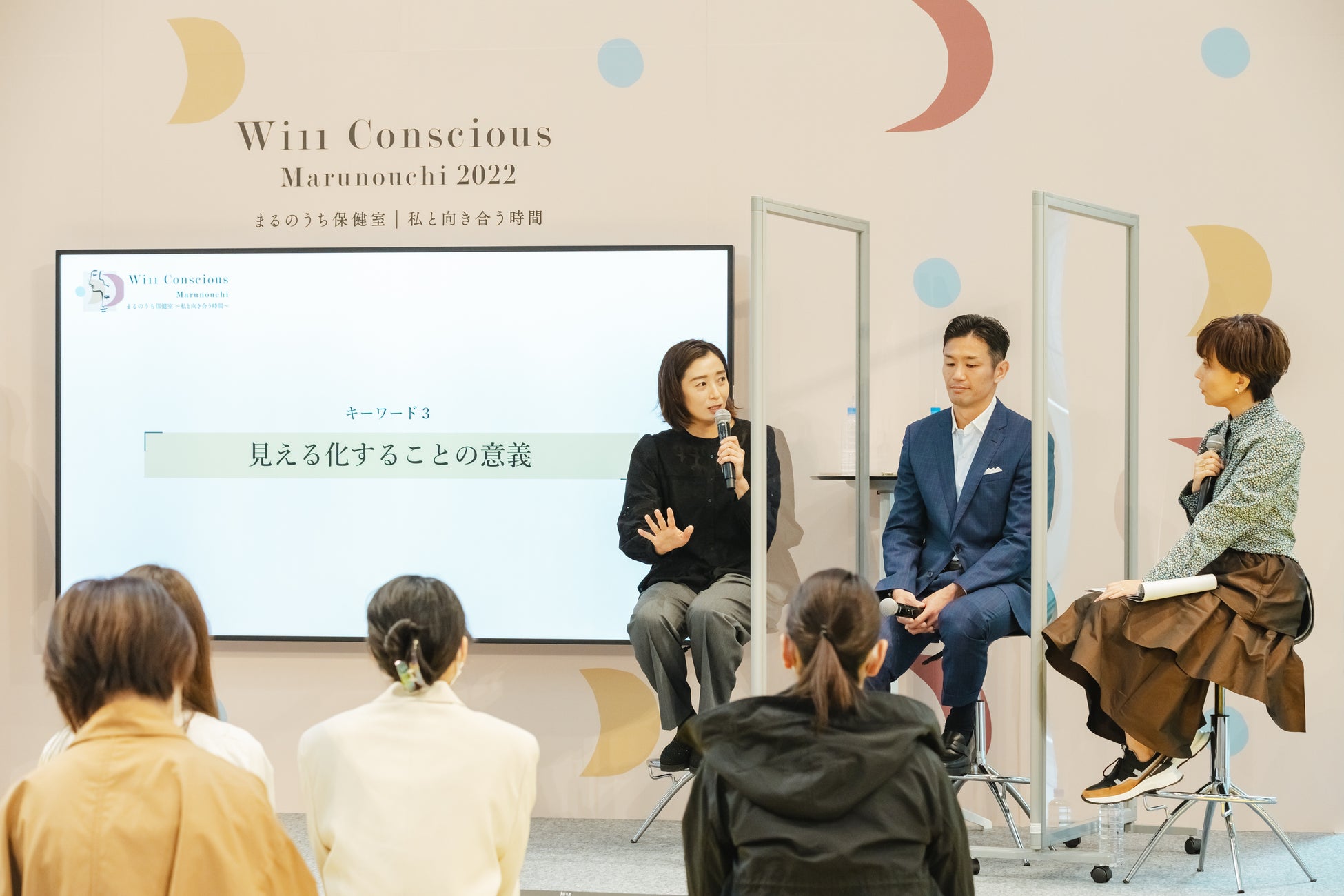 三菱地所株式会社は、株式会社ファムメディコ、株式会社ファミワン、神奈川県立保健福祉大学の協力のもと、働く女性※1が自分自身と向き合う時間をつくること、そして対話することの大切さを再認識していただくことを目的とした体験型ウェルネスイベント「Will Conscious Marunouchi 2022 まるのうち保健室 〜私と向き合う時間〜」を10月27日(木)・28日(金)の2日間、丸ビル1階マルキューブにて開催しています。初日のオープニングステージには、取り組みの概要説明や、働く女性たちの課題を見える化する取り組み「働く女性 健康スコア」の紹介のほか、ゲストとして競泳元日本代表 伊藤華英さん、元ラグビー日本代表キャプテン 廣瀬俊朗さんをお招きしてトークセッションを行いました。