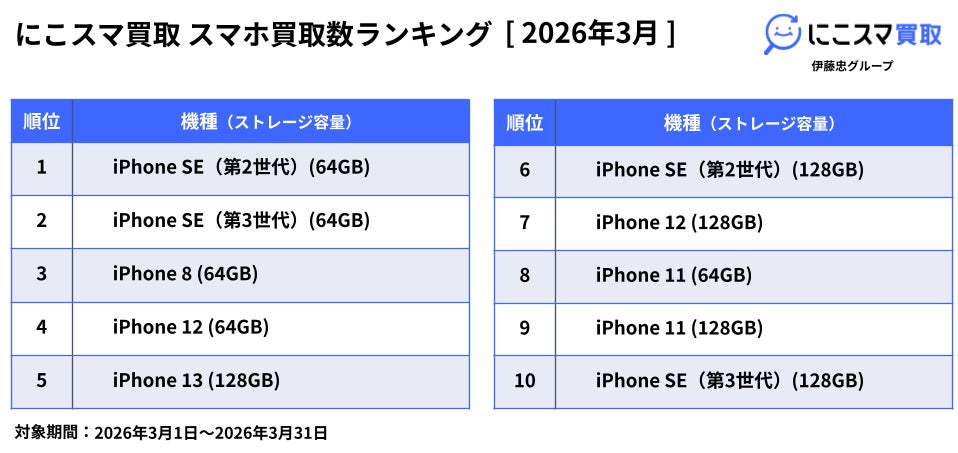 中古スマートフォンの個人向け販売・買取サービス「にこスマ」を運営する株式会社Belong(本社:東京都港区、代表取締役社長:西村 耕一郎 以下、「Belong」)は、「にこスマ」における2026年3月の中古スマホ/機種別販売数・買取数ランキングを発表します。