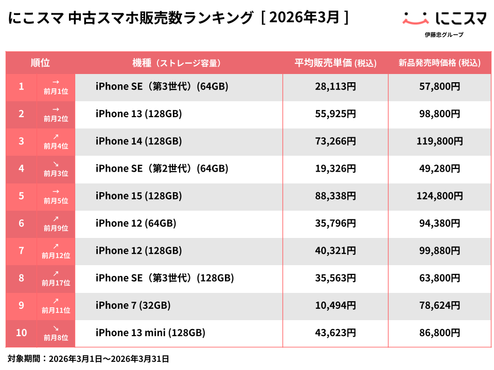 にこスマ|2026年3月中古スマホ販売・買取数ランキング