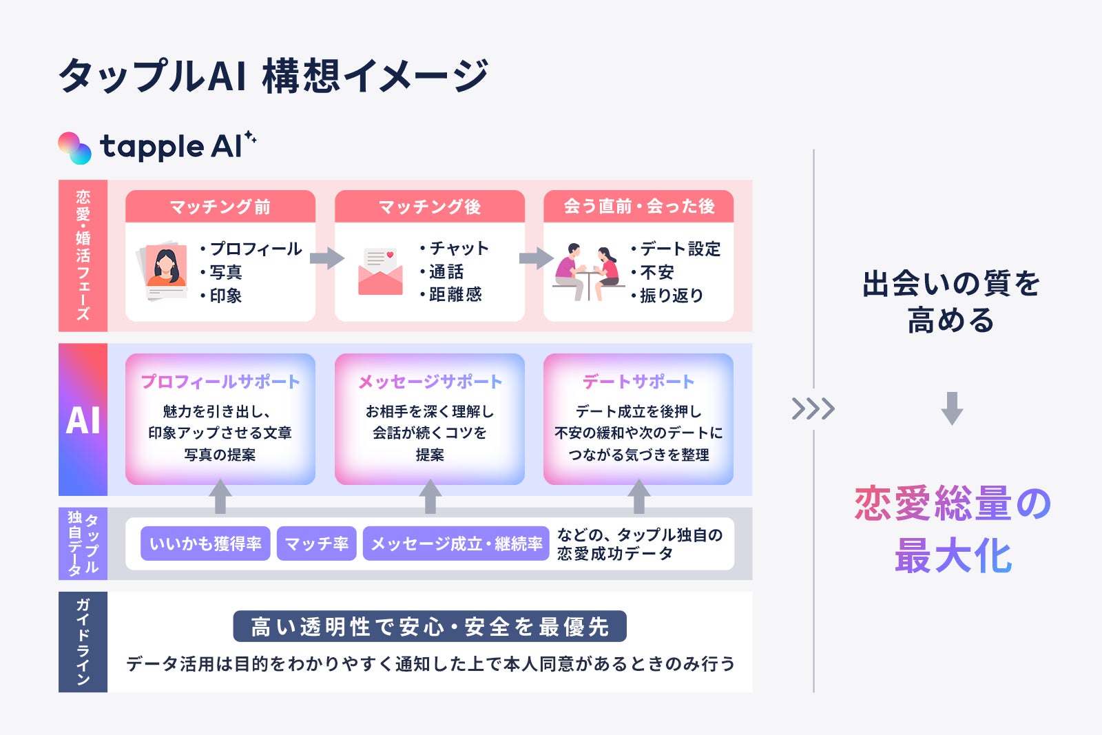 「タップル」ならではのデータ資産を備えた生成AIの活用により、出会いの質を高め、より多くの利用者の恋活・婚活をサポートしてまいります。