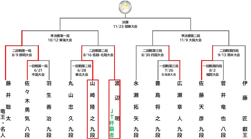 両者の対戦成績は渡辺JT杯覇者の12勝6敗。戦型を見ると、角換わり7局、相掛かり6局、横歩取り2局、角交換振り飛車2局、矢倉1局。山崎九段が主導した戦型を、渡辺JT杯覇者が受けて立つ展開が多い傾向にある。角換わりの多くは以前に流行し、山崎九段が後手番で得意にしていた一手損角換わりだ。しかし、近年は一手損角換わりの採用率が減っており、山崎九段は後手番では△3三金型角換わりや雁木模様の将棋などを指している。以上の傾向から、今回も相掛かりか、山崎九段が趣向を凝らした相居飛車戦の可能性が高い。渡辺JT杯覇者は体調不良により、4月から6月にかけて休場していたが先日のA級順位戦の復帰初戦を見事な勝利で飾り、ブランクを感じさせない強さを見せた。本局は「JT杯」連覇に向けた初戦となる。山崎九段は昨年の棋聖戦で挑戦者となって以降は調子を落としていたが、今期は現在まで9勝4敗と復調している。この勢いに乗って勝ち進みたいところだ。両者ともに「JT杯」など早指し棋戦での優勝経験が多数ある。渡辺JT杯覇者は理論派、山崎九段は感覚派でタイプは対照的。そのぶつかり合いで生じる見ごたえある丁々発止の応酬は見逃せない。