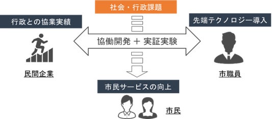 スタートアップを含む民間企業と市職員が協働して行政課題や社会課題の解決に取り組むことで、企業の成長と市の課題解決を目指します。