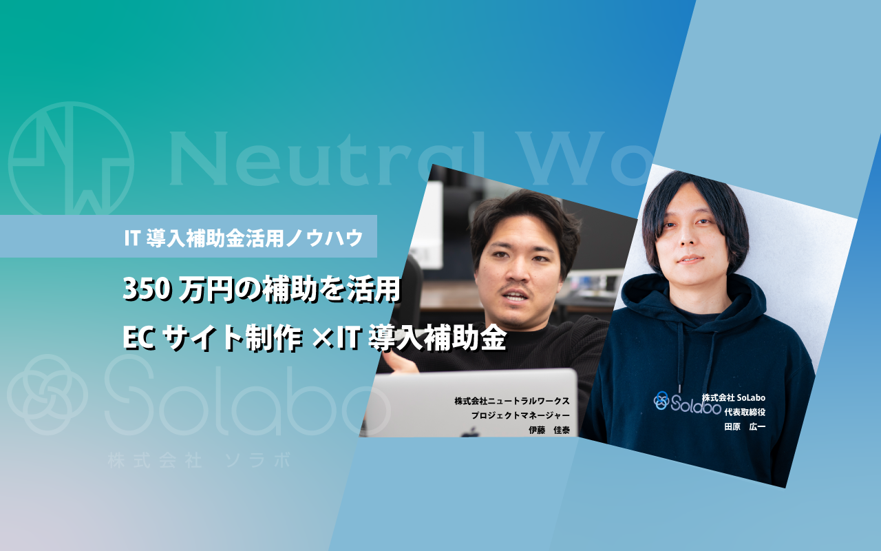 株式会社SoLabo(本社:東京都千代田区、代表取締役:田原広一、以下、SoLabo)は、株式会社ニュートラルワークス(本社:神奈川県茅ヶ崎市、代表取締役:三木五月、以下、ニュートラルワークス)と共同で、オンライン無料ウェビナー「350万の補助金を活用して、ECサイト作りませんか 補助金活用方法ご紹介」を4月27日(木) 16時より実施いたします。