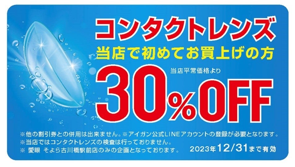 オープン企画!コンタクトレンズも大変お得!当店のLINEアカウントご登録で2023年12月31日(日)までコンタクトレンズが当店平常価格より30%OFFとなります。