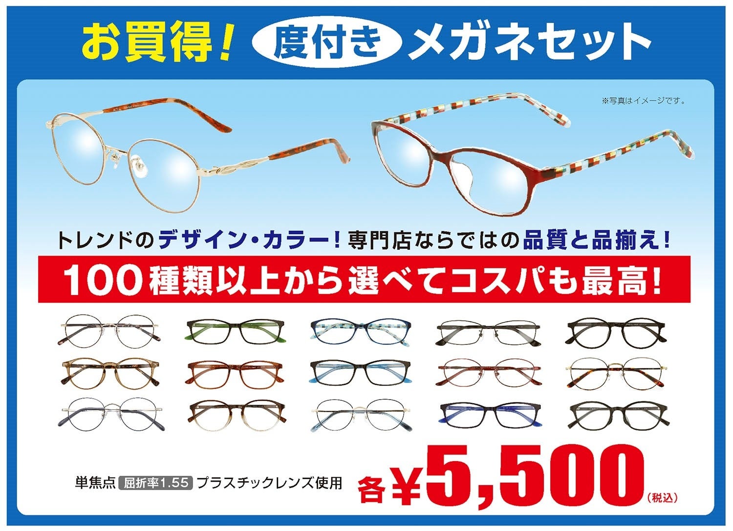 店内メガネはレンズ付き価格で、¥13,200(税込)以上のメガネは、近視・遠視・乱視・老視・遠近両用まで追加料金なしでお作りいただけます。