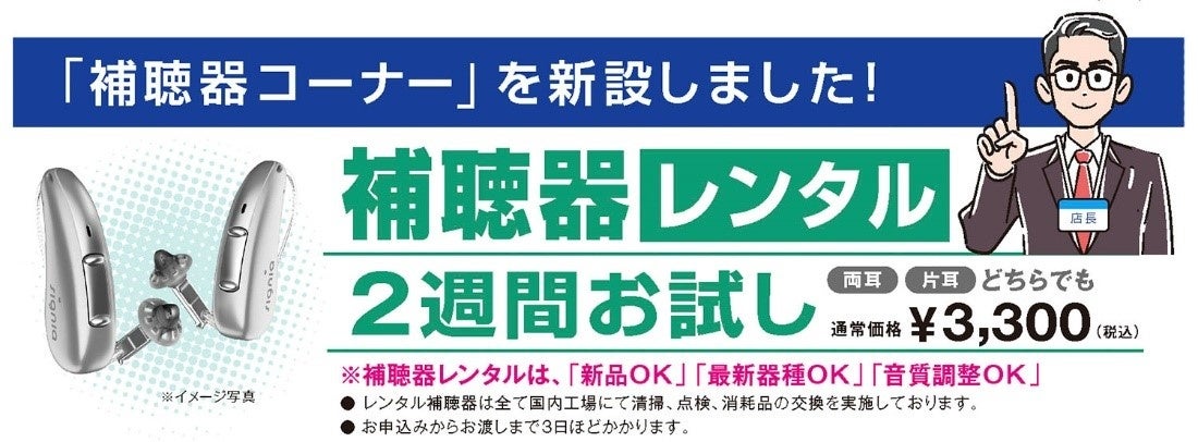 補聴器は、お客様の聞こえに合わせた最新の補聴器を2週間お試しできる「補聴器レンタル¥3,300(税込)」も実施しております。